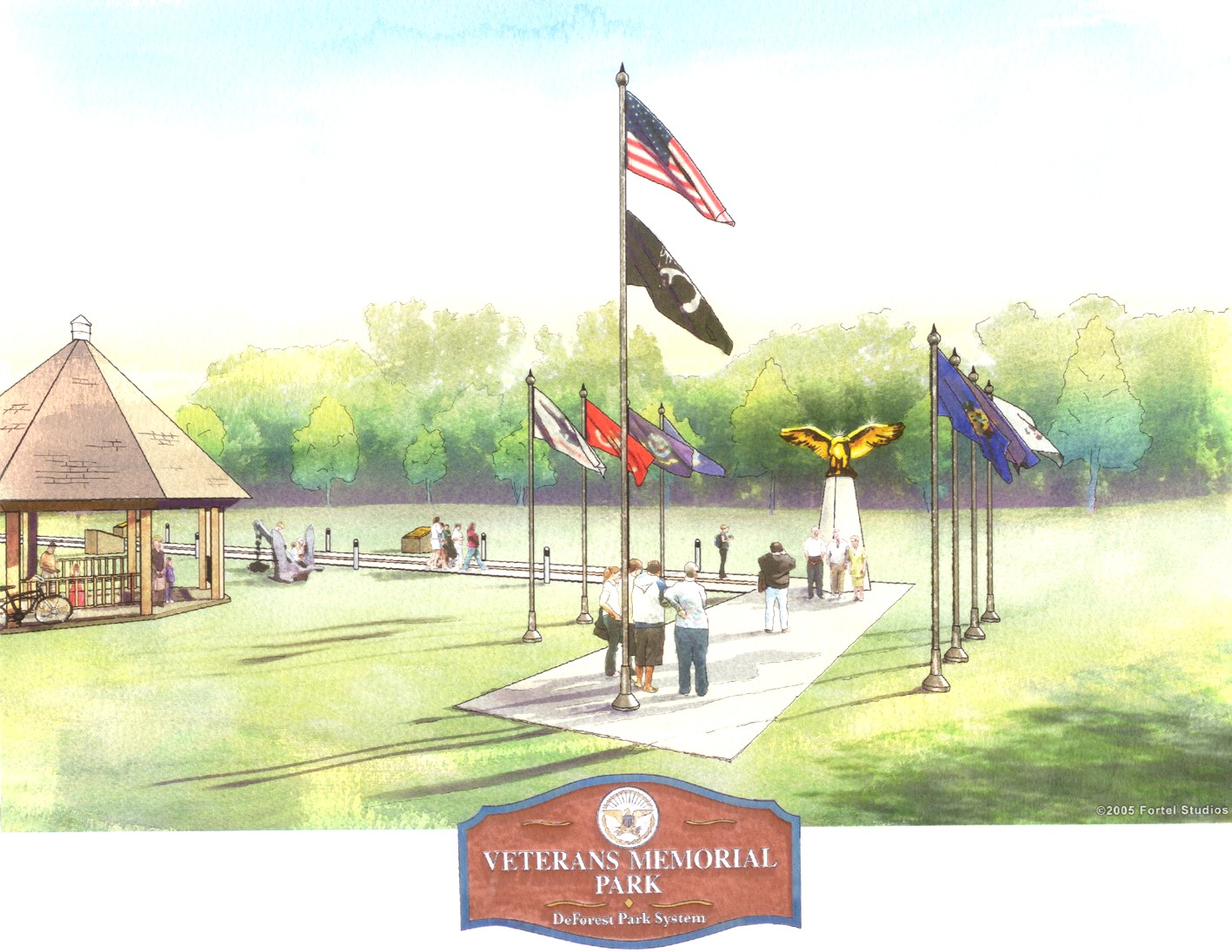 View of the ceremonial pad, flags and eagle