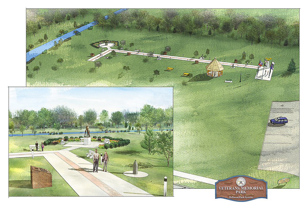 Overall view of the park with inset of the “Memorial to the Fallen”